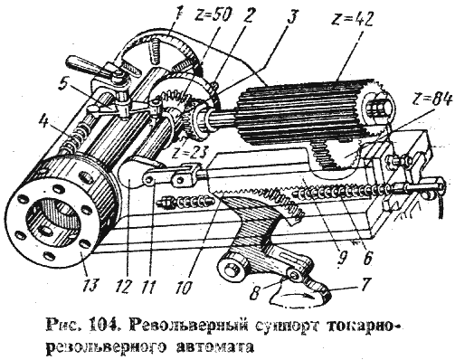 Револьверный суппорт (рис. 104) получает рабочую подачу от кулачка 7 через зубчатый сектор 10 и рейку 9. При этом пружина в постоянно отжимает суппорт вправо, поджимая ролик толкателя 8 к кулачку. Для смены рабочей позиции головки 13 необходимо быстро отвести суппорт вправо, что обеспечивается кривошипным механизмом 12, 11. В самом начале поворота кривошипа кулачок 3 через рычаг 5 выводит из гнезда фиксатор 4, позволяя осуществить поворот револьверной головки мальтийским механизмом (крест 1, водило 2). Весь суппорт с широким зубчатым колесом получает возвратно-поступательное движение относительно неподвижного в осевом направлении колеса z = 84. После смены рабочей позиции головки и подвода нового инструмента к заготовке инструмент начинает резание за счет перемещения револьверного суппорта от кулачка 7.