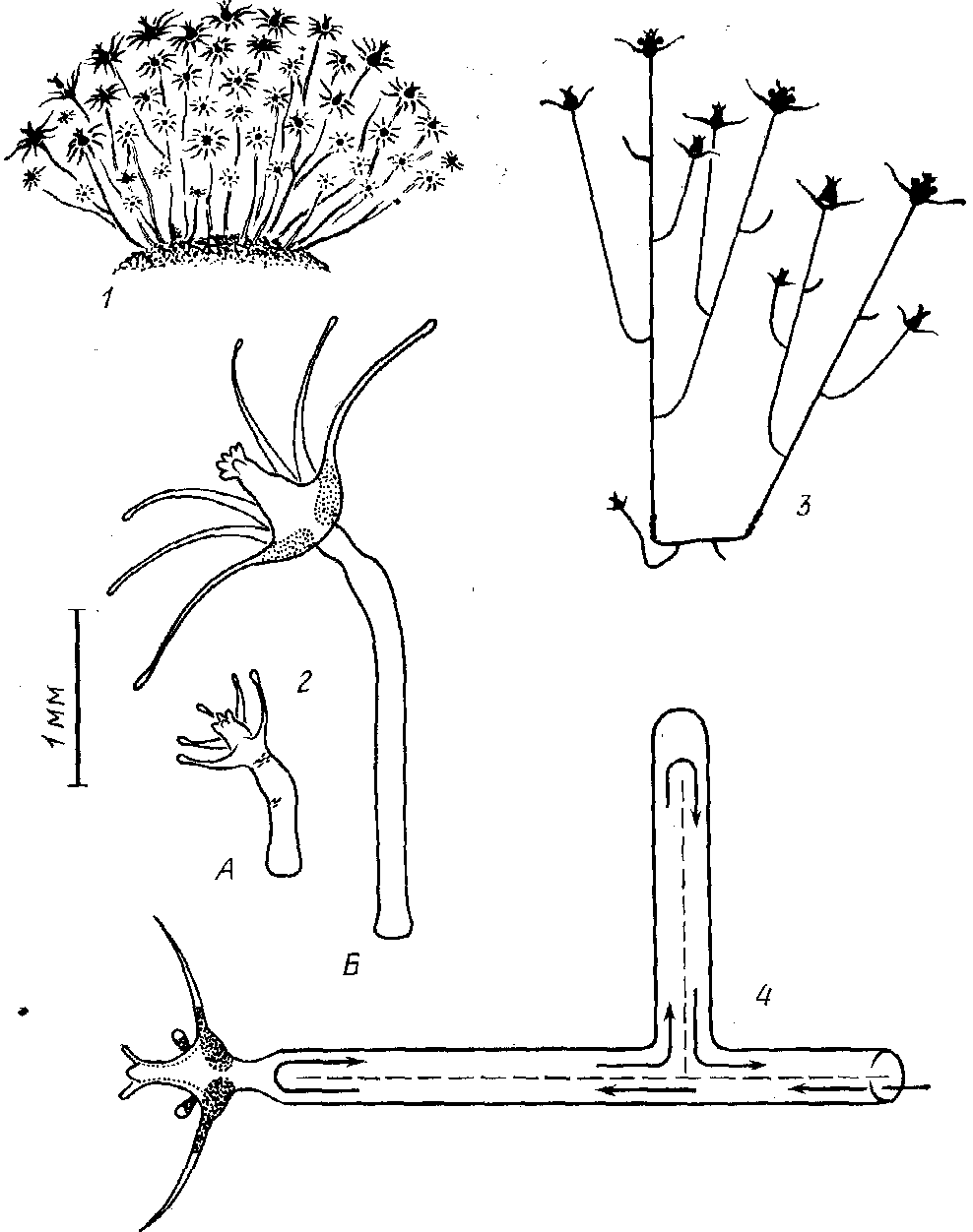 Tubularia larynx Ellis et Solander, 1786: 1— общий вид зарослей в форме полусферического куста; 2 — рисунок осевшей актинулы через сутки (А) и первичного гидранта, выросшего из нее, через неделю (В); 3 — схема строения небольшой колонии; 4 — схема перемещения гидроплазмы (стрелками) в ценосарке колонии (пунктиром изображен мезентерий); диаметр ствола завышен. Масштаб относится к 2