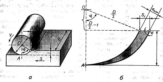 Рис. 1.10 - Елементи режиму різання при зустрічному фрезеруванні циліндричною дисковою фрезою