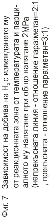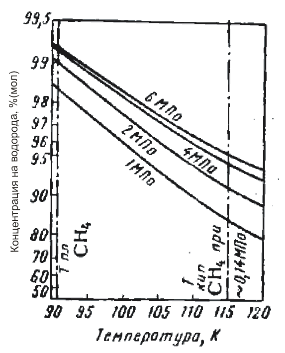 Отделяне на водорода от негови смеси с газообразни въглеводоро-ди чрез метода на фракционна кондензация се провежда с охлаждане на газовата смес до температури, при които въглеводородите преминават в течно състояние, а водородът остава в газообразно. Разделянето се осно-вава на разлики в парциалните налягания на водорода и въглеводороди-те. Концентрирането на водорода представява по същество задача свър-зана с отделянето на водорода от метана, доколкото другите въглеводоро-ди кондензират при по-високи температури от метана. Равновесието на системата водород – метан се определя от режимните условия по темпе-ратура, необходими за получаване на водород с необходимата степен на чистота. На фигура 11 е показана зависимостта на концентрацията на по-лучавания водород от температурата при различни налягания. Конденза-цията на метана се води при 2 – 6 МРа. Както се вижда от фигурата, водо-род с концентрация 95% може да се получи при налягане 2 МРа и темпе-ратура минус 166 0С, а при 6 МРа – при температура минус 158 0С. За по-лучаване на водород с по-восока концентрация е необходима по-ниска температура.