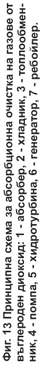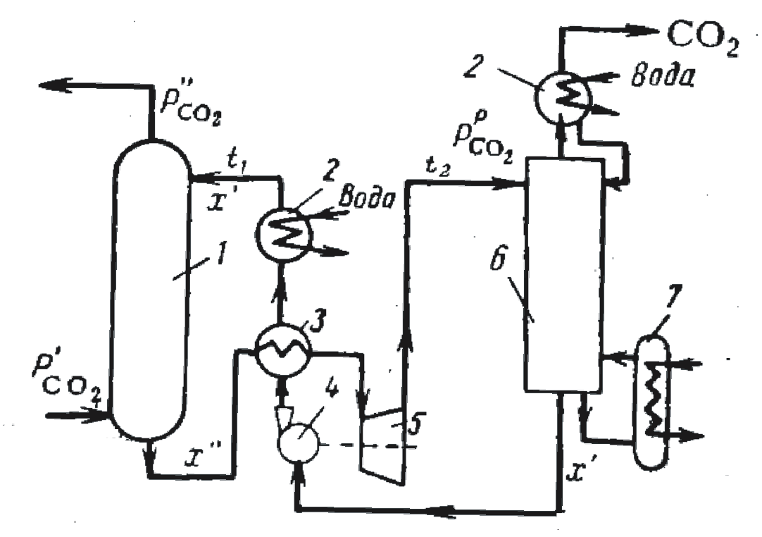 Принципната схема на абсорбционна очистка на газа от СО>2> и Н>2>S с нагряване на поглътителя в процеса на регенерация е показана на фигура 13. Газът се въвежда в абсорбер 1 отдолу и след очистване излиза отгоре. Регенерираният поглътител с температура t>1>, близка до температурата на върха на абсорбера, се подава отгоре. Поглътителят, наситен на въглеро-ден диоксид, се извежда от абсорбера и преминава през топлообменник 3, където се подгрява за сметка на топлината на регенерирания поглътител. Ако процесът протича при по-високо налягане, отколкото налягането в регенератор 6, то понижаване налягане на поглътителя се извършва, като го прекарват през турбина 5; при това от поглътителя се отделя част от СО>2>.