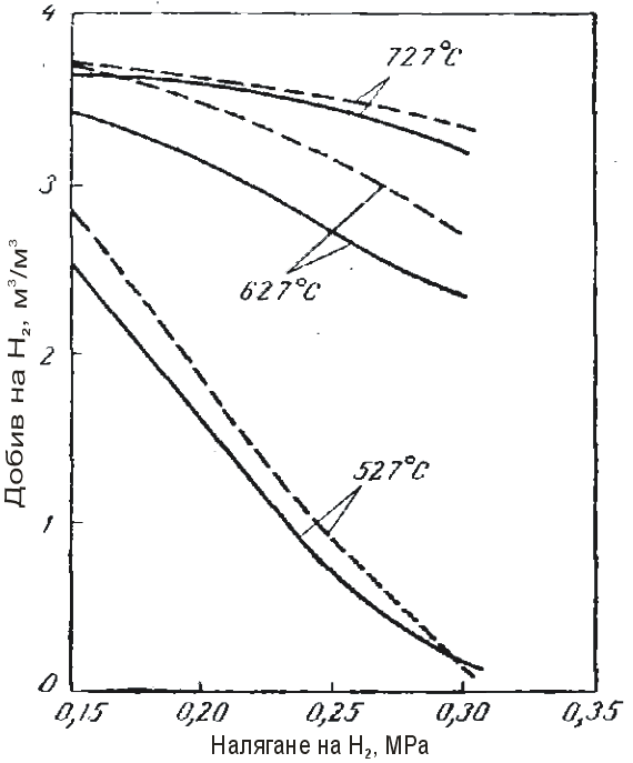 Температура, К Налягане, МРа Съдържание на Н>2>, % (мол)