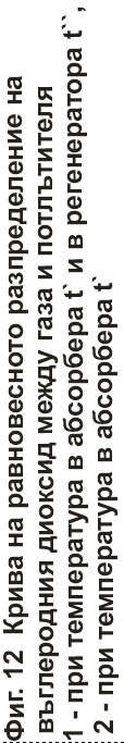 Кривата на разпределение, тоест зависимостта на количеството на газа, погълнато от течността, от парциалното налягане на газа на течност-та p>CO>>2>, p>H>>2>>S> се опледеля за всеки поглътител експериментално. Общият характер на кривите на разпределение е показан на фигура 12, от която е видно, че поглътителя имащ крива на разпределение 1 е по-малко ефек-тивен от този с крива на разпределение 2, тъй като неговата поглъща-емост при едно и също парциално налягане. За достигане на тази степен на очистка регенерацията на поглътител 1 трябва да е по-дълбока (х``>1><x``>2>). Подгряването на поглътителя в регенератора до t``>1> позволява да се достигне необходимата дълбочина на регенерация х``>1> при по-висо-ко парциално налягане на СО>2> в регенератора и да се създадат условия, при които парциалното налягане на СО>2> по-високо от равновесното, тоест рр>СО2>>р``>СО2>.