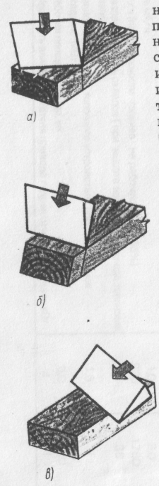 Удельная сила резания древесины поперек волокон примерно в четыре раза меньше, чем резания в торец. Поперечное резание обозначается знаком ≠. Помимо указанных выше основных видов резания, на практике применяют резание под углом (рис. 3, а, б, в), в этом случае резец движется под некоторым углом к направлению волокон.