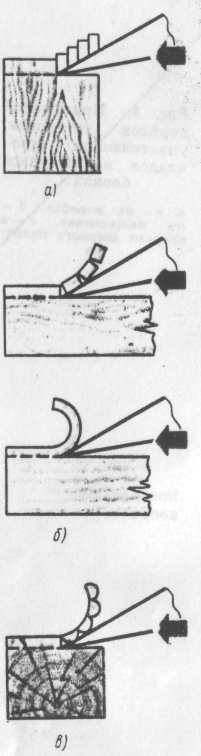 Поперечное резание (рис. 2, в) происходит при движении резца в плоскости волокон, перпендикулярном их направлению. При таком резании стружка получается короткой и ломкой, а поверхность шероховатой. Только при тепловой обработке (распаривании) и при обжиме древесины перед резцом получается стружка в виде непрерывной ленты хорошего качества (лущение шпона).