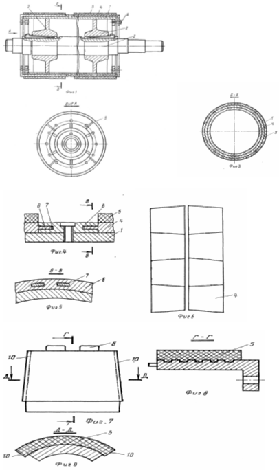 Слой футеровки 5 имеет напуски 10, благодаря чему при затяжке болтов 9 клиновидные сектора, соприкасаясь между собой краями футеровки, расклинивают друг друга. В результате достигается напряженное состояние и сдвигающая рабочая нагрузка воспринимается как одно целое. Кольцо 6 осуществляет силовую связь футеровок обеих половин барабана с цилиндрическим корпусом.