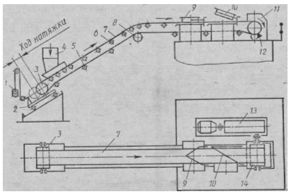 Обычно ленточные конвейеры имеют тяговый элемент 7 (рис.1) в виде бесконечной ленты, являющейся и несущим элементом конвейера, привод 13, приводящий в движение барабан 14, натяжное устройство 2 с барабаном 3, груз 1, роликовые опоры 6 на рабочей ветви ленты и 5 на холостой ветви ленты, отклоняющий барабан 8, загрузочное устройство 4 и разгрузочные устройства 9 и 10, разгрузочный желоб // и устройство 12 для очистки ленты. Все элементы конвейера смонтированы на раме.