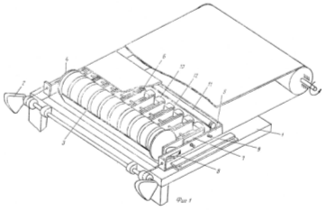 Механизм перемещения устанавливается на корпусе 5 и состоит из опор 6, скользящих в направляющих планках 7, и натравляющих роликов 8. Планки присоединяются винтами 9 к корпусу. Корпус связан с натяжным элементом 2 и расположен подвижно на раме. Опоры снабжены прижимными элементами 10.