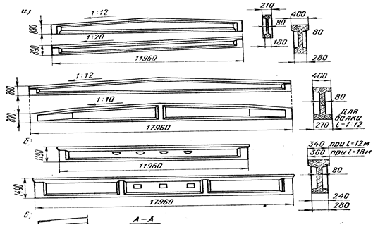 При пролетах 6 и 9 м балки изготовляют таврового сечения и имеют высоту на опоре от 550 до 790 мм а для пролётов 12 и 18 м поперечное сечение их - двутавровое с высотой на опоре от 790 до 1490 мм.
