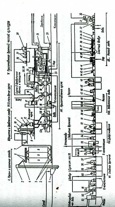 Охлажденное (начальное) сусло заливают в закрытые бродильные аппараты 58 и 59, сюда же добавляют дрожжи из аппарата 60 для разбраживания. По окончании главного брожения, протекающего в течение 6—8 суток, молодое пиво насосом 57 перекачивают в аппараты 52 и 53 для дображивания. Дрожжи, остающиеся на дне бродильных аппаратов, посредством вакуума, создаваемого вакуум-насосом 61, направляются в сборник 62 для повторного использования или в сборник 56 для продажи. Из сборника 56 давлением сжатого диоксида углерода дрожжи перемещают в фильтр-пресс 55. Пиво, отфильтрованное в фильтр-прессе, сливается в танк 54 для переработки. Отмывание дрожжей от остатков пива и охлаждение их производят водой, охлаждаемой в баке 63.