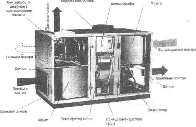 Опалювальні агрегати можуть використовувати в цивільних будинках: школах, дитячих садках, магазинах та ін. Сучасна конструкція такого агрегату (GOLD шведської фірми "PM-Luft - виробника вентиляційного обладнання) показана на рис.10. Установка є припливно-витяжною, обладнана пристроями для обробки двох потоків повітря: припливного - фільтром з скловолокном, теплообмінником, вентилятором; витяжного - фільтром і вентилятором. Крім того, устатковується калорифером або охолоджувальною камерою, які входять в комплект установки. Продуктивність установок становить 500-13000 м3/год і напір до 1000 Па.