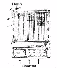 Рис.13. Конструкція сталевого пластинчастого одноходового калорифера (марка КФС): 1 - підвідний штуцер; 2 - металева розподільна коробка; 3 - пластини-ребра; 4 - трубки для теплоносія; 5 - відвідний штуцер; 6 - металева збірна коробка