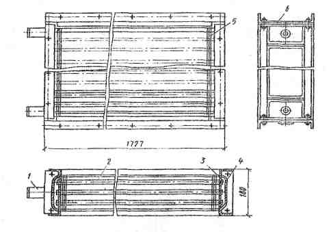 Рис.15. Конструкція сталевого пластинчастого одноходового калорифера (марка КВСБ-П):1 - приєднувальний штуцер; 2 - трубки для проходження теплоносія; 3 - металева розподільна коробка з трубною решіткою; 4 - кришка розподільної коробки; 5 - гофровані стальні пластини, які насаджені на трубки; 6 - боковий щиток.