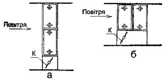 Рис.17. Встановлення калориферів по напрямку повітря (схематично): а - паралельно; б - послідовно; К - обвідний клапан