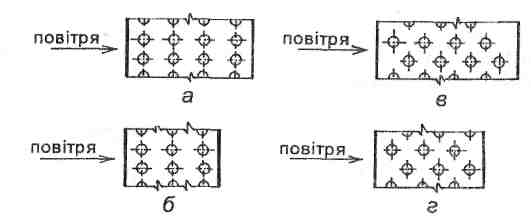Рис.14. Моделі калориферів (схематично): а - велика з коридорним розташуванням трубок; б - середня з коридорним розташуванням трубок; в - велика з шаховим розташуванням трубок; з - середня з шаховим розташуванням трубок.