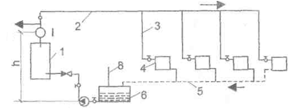 Рис.8. Схема розімкнутої системи парового опалення низького тиску:1 - котел; 2 - парова магістраль; З - паровий стояк; 4 - опалювальні прилади; 5 конденсатопровід; 6 - кондеисатний бак; 7 - насос; 8 - повітряна трубка дозволяє передавати її на значні відстані і радіус дії таких систем суттєво збільшується.