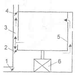 Рис.10. Схема системи повітряного опалення, суміщеної з вентиляцією:1,2, 4 - клапани; 3 - витяжний канал; 5 - канал для подачі нагрітого повітря; 6 - калорифер