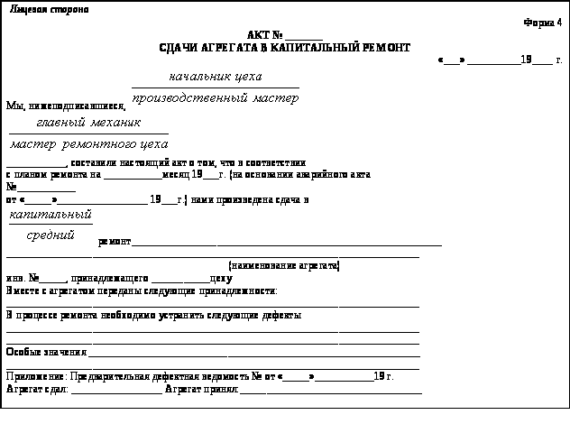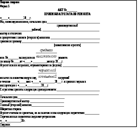 Сдача и приемка машины в ремонт и из ремонта производятся по актам (формы 14 и 15). При приемке машины из ремонта необходимо производить ее испытание в течение первой смены при нормальной загрузке.