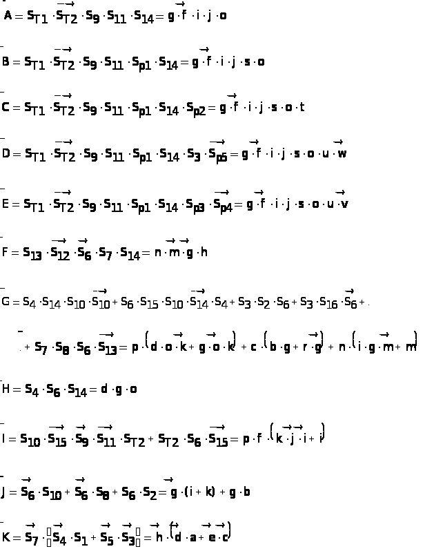 Исходное состояние системы следующее: Робот находится в крайнем правом положении, т.е. датчики S7 и S13 включены; привод транспортера отключен, что соответствует выключенному датчику SрМ5; деталь отсутствует в позиции захвата, т.е. датчик S12 отключен; пиноль станка в крайнем правом положении, т.е. датчик S15 включен; система ЧПУ отключена, что соответствует включенному датчику Sт2 и выключенному датчику Sт1. В соответствии с вышесказанным функция начального состояния запишется в виде: