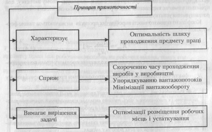 Прямоточність - принцип раціональної організації процесів, який характеризує оптимальність шляху проходження предмету праці. Досягають принципу прямоточності за допомогою розміщення цехів, дільниць і робочих місць відповідно до послідовності протікання технологічного процесу.