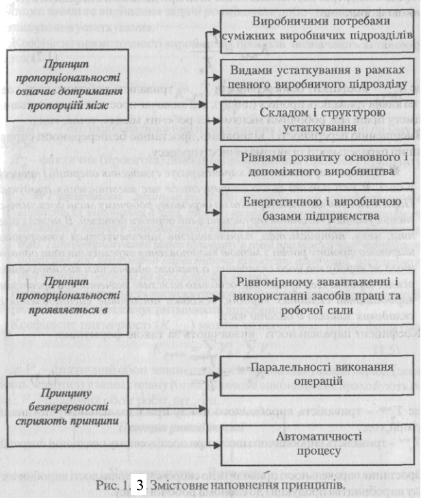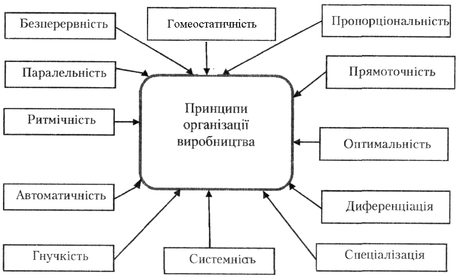 Розподіл протікання процесу в часі, тобто техніко-економічне планування і, оперативне диспетчерування і регулювання ходу виробничого процесу, розподіл робітників за сферами діяльності (дільницях, цехах) і організація їх праці, виготовлення і реалізація готової продукції здійснюються на певних організаційних засадах, в основі яких лежать такі основні принципи: пропорціональності, безперервності, прямоточності, ритмічності, диференціації, спеціалізації, автоматизації, гнучкості, системності, оптимальності, гомеостатичності… (рис. 1.2.)