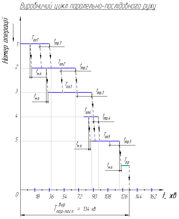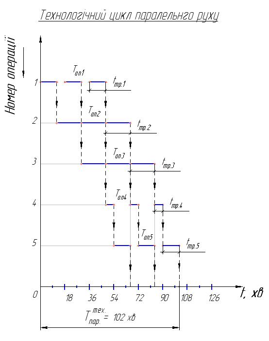 де Т>ц>пар- - тривалість виробничого циклу при паралельному поєднанні операцій, год.; Т>ц>пос - тривалість виробничого циклу при послідовному поєднанні операцій, год.