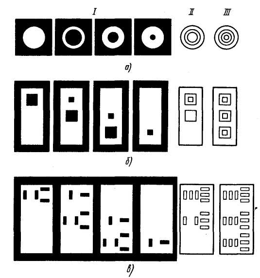 а - концентрические окружности, б - вложенные квадраты, в - биссекторные знаки