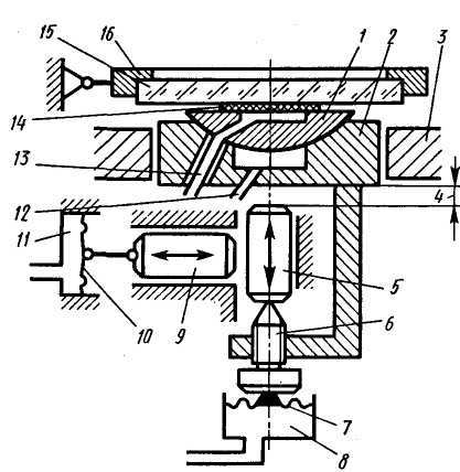 При контактной фотолитографии операцию совмещения выполняют с помощью специального механизма совмещения микроизображений (Рисунок 2), основными элементами которого являются предметный шаровой столик 1 со сферическим основанием - гнездом 2, рамка 16 для закрепления фотошаблона 15 и устройство перемещения рамки и поворота предметного столика.