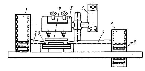 1, 8 - подающая и приемная кассеты, 2, 7 - конвейеры, 3 - устройство совмещения, 4 - фотошаблон, 5 - микроскоп, 6 - осветитель, 9 - подложки