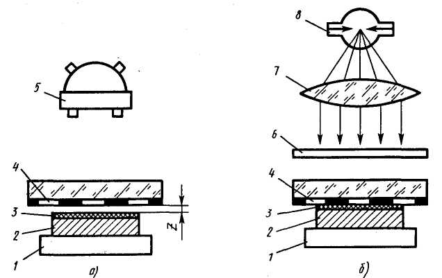 Рисунок 3. Схемы совмещения (а) и экспонирования (б):