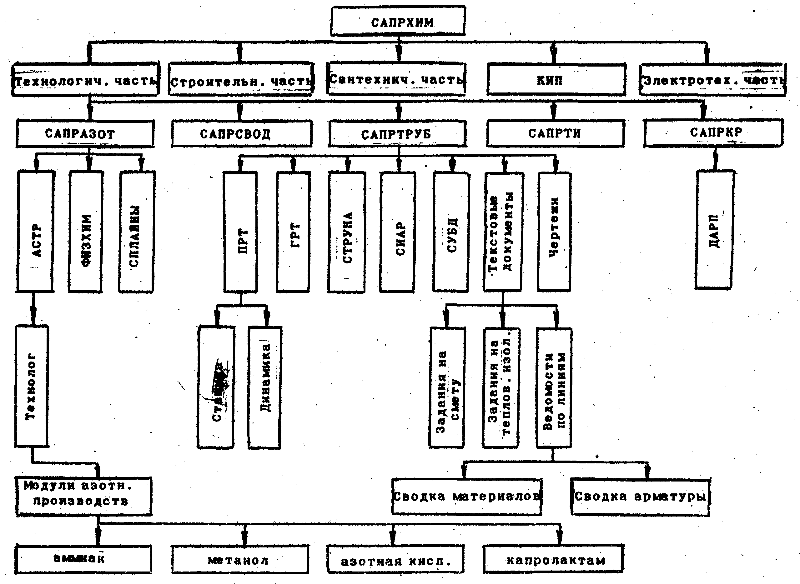 В более низких иерархических уровнях подсистемы САПРАЗОТ имеет библиотека общетехнологических модулей "Технолог", а далее модули азотных производств: "аммиак", "метанол", "азотная кислота", "капролактам".