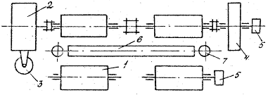 1 и – беговой ролик; 2 –нагружатель; 3 – датчик крутящего момента; 4 – инерционная масса; 5 – тахогенератор; 6 – выталкиватель колес; 7 – колёсоотбойник.