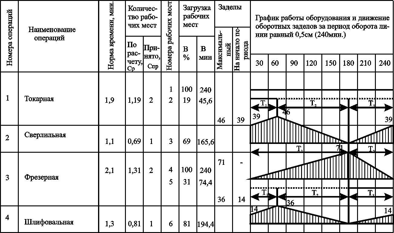 На самом стандарт-плане или выделив из него все элементы (рис. 2) необходимые для расчета межоперационных оборотных заделов, между каждой парой смежных операций устанавливаются частные периоды времени, в течение которых работает неизменное число единиц оборудования. Например, такими частными периодами между 1й и 2й операциями являются: Т1, Т2 и Т3, между 2й и 3й – Т1 и Т2 и т. д. (см. рис. 2). Далее, исходя из загрузки рабочих мест определяется продолжительность каждого частного периода и заносится в графу 2 табл. 1. Например, Т1 = 45,6 мин., Т2 = 165,6 – 45,6 = 120 мин., Т3 = 240 – 165,6 = 77.4 мин. В графе 3 данной таблицы исходя из норм времени на выполнение смежных операций и количества единиц оборудования, по приведенной выше формуле, определяется величина оборотного задела по каждому частному периоду. После этого строится график движения оборотного задела (эпюры заделов) по каждой паре смежных операций за период оборота линии (рис. 2).
