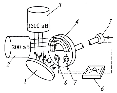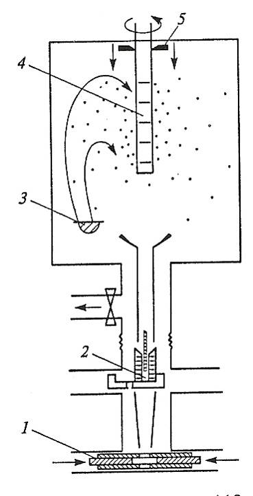 Рисунок 1. Схема установки Глейтера: 1 - узел компактирования при высоком давлении; 2 - узел предварительного прессования; 3 - испаритель; 4 - вращающийся коллектор, охлаждаемый жидким азотом; 5 - скребок