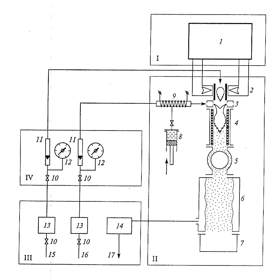 I – силовое оборудование (1 - микроволыовый генератор); II – основное технологическое оборудование (2 - плазмотрон, 3 - устройство ввода реагентов, 4 - реактор, 5 - теплообменник, 6 - фильтр, 7 - сборник порошка, 8 - дозатор реагентов, 9 - испаритель); III, IV – соответственно вспомогательное технологическое оборудование и блок управления (10 - вентили, 11 - ротаметры, 12 - манометры, 13 – система очистки газов, 14 - скруббер, 15 – ввод плазмообразующего газа, 16 - ввод газа-носителя, 17 - вывод газов)