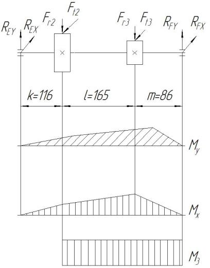 Ft2 = 4706 H, Fr2 = 1713 H, k = 116 мм, l = 165 мм, m = 86 мм.