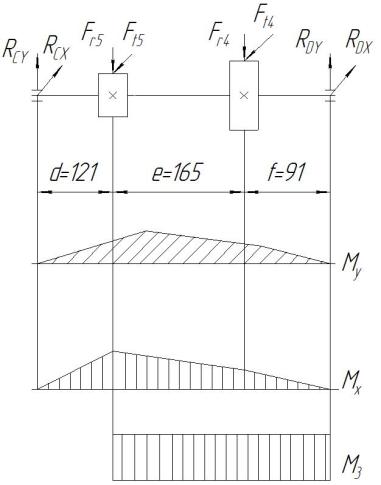 Мх = RDY(e+f) – Fr4e = 6331 · 0,256 – 4200 · 0,165 = 928 Н·м;