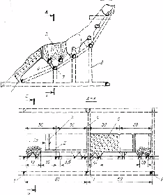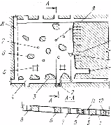 Параллельно с проведением восстающего производятся работы по проведению штрека грохочения 13 и подсечного штрека 8. Затем проходят рудоспуски 9, верхнюю часть которых оформляют в приемные воронки 2.
