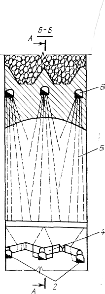 Подготовка блока заключается в проведении трех рудных штреков 2, из которых на уровне их кровли проходят наклонные выработки 4 с нишами для монтажа вибрационных погрузочно-доставочных установок. Из наклонных выработок проходят выпускные дучки 3, которые затем оформляются в выпускные воронки. На уровне горизонта воронок проходят подсечной штрек 1. Разбуривание массива осуществляют глубокими скважинами 5, разбуренными из штреков 6 вышележащего горизонта. Руду отбивают таким образом, чтобы потолочине придать форму купола. Руду выпускают и доставляют с помощью высокопроизводительных погрузочно-доставочных вибрационных установок.
