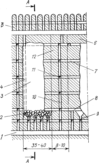 Очистные работы начинают с проходки от отрезного восстающего передовой выработки 12, которая сбивается (соединяется) с откаточным штреком рудоспусками 4. Вдоль наклонного отрезного восстающего бурят горизонтальные шпуры, после взрыва которых восстающий расширяется и создается сплошной забой; отбойку руды ведут взрыванием зарядов в шпурах 10. Доставку руды до рудоспусков производят с помощью скреперов 11 с лебедками, установленными в специальных камерах 2, образованных из откаточного штрека.