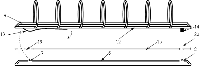 На накладную пластину 6, прикреплённую к переплётной крышке 2, накладывается карманный вкладыш 15 так, чтобы выемка 19 и отверстие 20 совпадали с отверстиями для крепления 7 и 8 соответственно. Для крепления направляющее звено 13 кольцевого механизма 9 пропускается через выемку 19 и вставляется в верхнее отверстие 7. При этом цилиндрический фиксатор 14 кольцевого механизма 9 пропускается через отверстие 20 и вставляется в принимающее отверстие 8 накладной пластины 6.