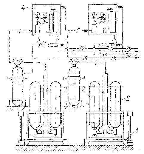 1 – ваги; 2 – балони з рідким хлором; 3 – проміжний балон; 4 – хлоратор; 5 – ежектор.