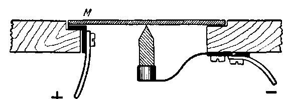 К угольной микрофонной мембране М, закрепленной на пластине, снизу прижат уголь дуговой лампы с остро заточенным кончиком. В электрическую цепь включают предохранительное сопротивление и выключатель. Ток идет от мембраны к углю; при замыкании тока место касания уголька и мембраны сильно нагревается, и на мембране появляется накаленное резко ограниченное пятно, которое после охлаждения можно узнать по темному цвету. Спаиваемые проволоки выравниваются на мембране так, чтобы место спая приходилось как раз на пятне, после чего, пользуясь флюсом и серебром или оловом с паяльной жидкостью, производят пайку, замыкая в цепи ток.