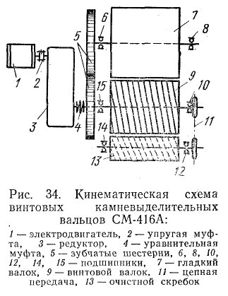 К валкам прикреплены очистные скребки. Неподвижный скребок очищает гладкий валок, а подвижный скребок 13 - винтовой валок. Валки устанавливают на специальных пластинах, прикрепленных к раме. Зазор между валками по мере их износа регулируют за счет передвижения винтового валка. Валки цапфами опираются на подшипники в, 8, 10 и 15, установленные в корпусах. Камни выходят с противоположной от привода стороны.