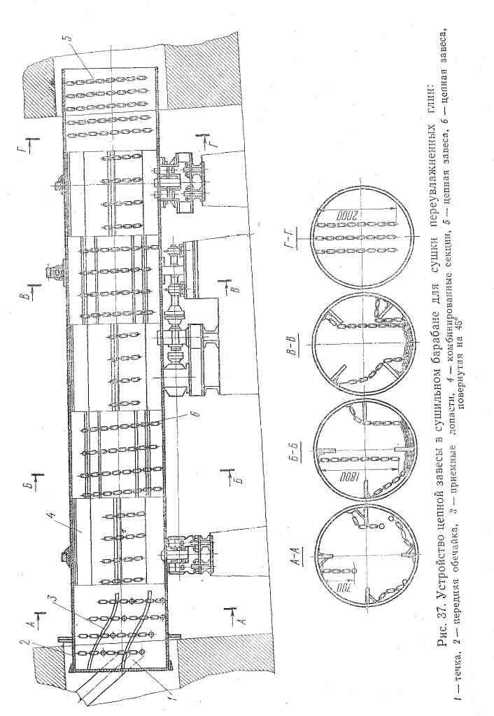 Для подсушки переувлажненной глины до формовочной влажности внутри барабана укрепляют цепную, завесу с продольными полками для ворошения глины (рис.37).