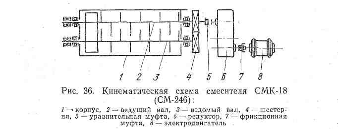 Смеситель работает по следующей кинематической схеме (рис.36). Электродвигатель 8, соединенный через фрикционную муфту 7 с редуктором 6 и уравнительной муфтой 5, приводит в движение ведущий вал 2 с лопастями, от которого через шестерни 4 передается вращение валу 3 в противоположную сторону.