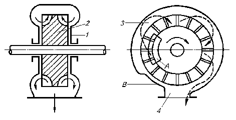 А – вхідне вікно; В – ущільнююча ділянка; 1 – корпус; 2 – робоче колесо; 3 – кільцевий канал; 4 – нагнітальний патрубок.