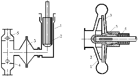 Рис. 3 - 17. Схема безсальникового насоса: 1 – корпус; 2 – робоче колесо: 3 – додаткове колесо; 4 – пружина; 5 – конічна втулка. |