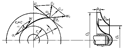 де – товщина лопатей; z – число лопатей; b>1> і b>2> – ширина робочого колеса на внутрішньому і зовнішньому колах відповідно; C>1r> і C>2r> – радіальні складові абсолютних швидкостей на вході в колесо й виході з нього, причому (C>1r >= C>1>).