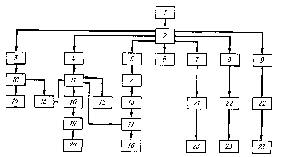 Рис.1. Схема процесса выделения стали и Других компонентов из автомобильного лома: - автомобильный лом; 2 - разборка; 3 - резина (шины); 4 - сталь (кузов и рама); 5 - литье (моторный блок); 6 - запасные части иа продажу; 7 - оконное стекло; 8 - цинк (трансмиссии, карбюраторы); 9 - медь (генераторы, стартер); 10 - сжигание шин; 11 - электрическая печь (плавление); 12 - сталь; 13 - литье; 14 - зола; 15 - стальные накладки иа колеса; 16 - электрическая печь (выдержка); 17 - печь; 18 - литье на продажу; 19 - прокатный стан; 20 - конструкционные материалы - армирующие стержни, стойки оград; 21 - печь для удаления слоистого покрытия; 22 - плавильная печь; 23 - товарный продукт